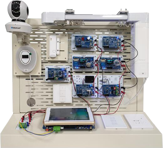 實訓臺涵蓋嵌入式接口技術(shù)、ZigBee自組網(wǎng)技術(shù)、WiFi無線通信技術(shù)、生物識別技術(shù)、網(wǎng)絡(luò)傳輸技術(shù)、應用軟件開發(fā)技術(shù)的知識點及智能家居行業(yè)應用知識。平臺采用Cortex-A9異構(gòu)網(wǎng)關(guān)作為家庭控制終端,集成溫濕度、光照度、空氣質(zhì)量、指紋識別等無線傳感器,燃氣、門磁等無線安防探測器,繼電器、窗簾電機、調(diào)光面板、強電插座等無線控制器,網(wǎng)絡(luò)攝像頭及電表等,實現(xiàn)家居環(huán)境監(jiān)測、安防監(jiān)控、智能入戶、家電控制、遠程抄表、視頻監(jiān)控等功能。提供家居設(shè)備安裝調(diào)試、組網(wǎng)傳輸測試、云平臺家居場景搭建、智能家居APP應用軟件開發(fā)、智能家居Web應用軟件開發(fā)等完整的實訓案例。實訓臺外觀如圖所示。