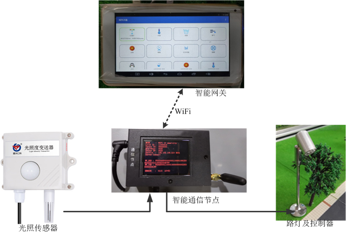 (1)路燈控制系統(tǒng):由智能通信節(jié)點及外圍驅動電路板、路燈、光照傳感器組成。智能通信節(jié)點實時采集光照度,通過無線通信方式傳輸至網關。結合網關應用程序,可以實現(xiàn)路燈開關控制、環(huán)境光照度定時采集,設置光照傳感器與路燈控制器的聯(lián)動策略,根據光照強度,自動控制路燈開關;同時將光照度數(shù)據、路燈開關狀態(tài)上傳到云平臺進行可視化展示,遠程路燈控制。