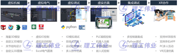 IMT數(shù)字孿生系統(tǒng)能夠從虛擬機(jī)械設(shè)計(jì)、虛擬電氣接線再到虛實(shí)互動(dòng)編程,虛擬調(diào)試以及集成調(diào)試的整個(gè)過程,同時(shí)配置XR互動(dòng)仿真,能夠?qū)崿F(xiàn)多人協(xié)作的沉浸式應(yīng)用,IMT系統(tǒng)具有多種仿真和組合方式,支持半實(shí)物、全虛擬、以及3D互動(dòng)的編程方式。