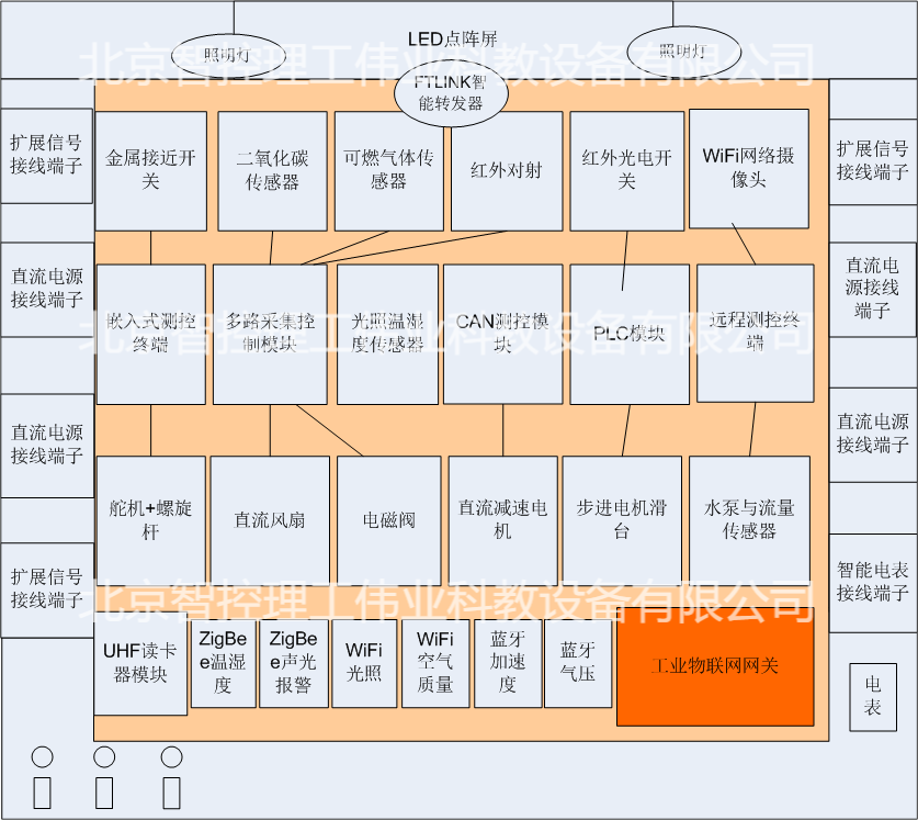 1、標(biāo)配網(wǎng)孔操作板、四組直流供電板、四組有線傳感器的供電通信板、六個無線傳感器節(jié)點(diǎn)、一個工業(yè)物聯(lián)網(wǎng)網(wǎng)關(guān)、兩個無線強(qiáng)電控制插座、四種交直流電源按鈕、指示燈、點(diǎn)陣顯示屏等,為行業(yè)應(yīng)用創(chuàng)新設(shè)計提供硬件支持。