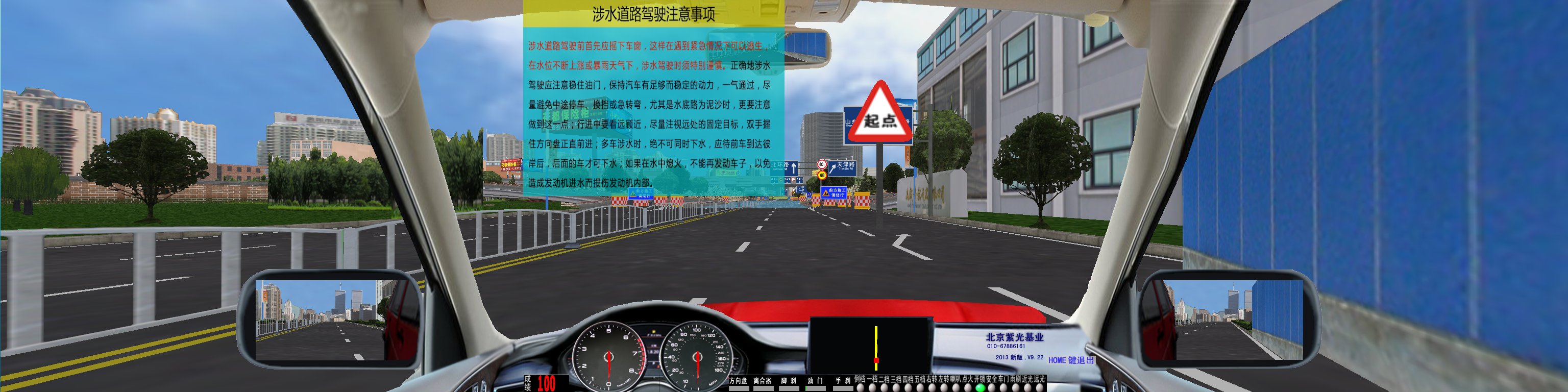 危險(xiǎn)場(chǎng)景:視線不清的交通情況下,超車后突然切入他人道引起被超車輛緊急制動(dòng)、自行車、行人突然橫穿馬路,路面維修,障礙物繞行等 危險(xiǎn)場(chǎng)景、專項(xiàng)駕駛:危險(xiǎn)道路、眩目道路、爆胎體驗(yàn)、緊急避讓、趣味駕駛等駕駛科目。炫目道路:(朝九晚五的太陽)炫目會(huì)車,炫目駕駛鄉(xiāng)村道路等。泥濘道路:泥濘洼地道路駕駛(方向、制動(dòng)、驅(qū)動(dòng)有打滑滯后感)場(chǎng)景模型取鄉(xiāng)村道路,道路變?yōu)槟酀魻顟B(tài)。石子路面:汽車在其上面行駛,遇到剎車時(shí)剎不住車,還可汽車還在繼續(xù)滑動(dòng),有時(shí)還會(huì)斜向滑行,極難控制感,汽車在石子路面里滑動(dòng)。涉水道路:涉水駕駛汽車有水流沖力對(duì)車輛的前進(jìn)阻力感光及側(cè)滑感,輪胎與水下的路壓力減小,驅(qū)動(dòng)力受到限制,使行駛受阻感覺。專項(xiàng)訓(xùn)練:要附合交通部要求。系統(tǒng)評(píng)分:每次駕駛結(jié)束,系統(tǒng)自動(dòng)評(píng)分。山區(qū)到路:突出坡多、彎多、凹凸路面、駕駛環(huán)境復(fù)雜、有側(cè)風(fēng)、有陡坡長(zhǎng)坡、溜坡、側(cè)滑(有語音提示)。鄉(xiāng)村道路:含鐵道路口;加油站,公交車站、單行道、農(nóng)田道口等;城市道路:含公交站臺(tái),高架立交橋、公交專用道、十字路口、丁字路口、環(huán)島、隧道、單行道、雙黃線、加油站、商場(chǎng)百貨門口斑馬線天橋,學(xué)校門口及紅綠燈,行人、非機(jī)動(dòng)車亂穿馬路及非機(jī)動(dòng)車等。高速公路:包括收費(fèi)站(入、停、出、)服務(wù)區(qū)、緊急帶、匝道行駛、超車道、行車道、隧道、立交橋、交通標(biāo)牌標(biāo)線。