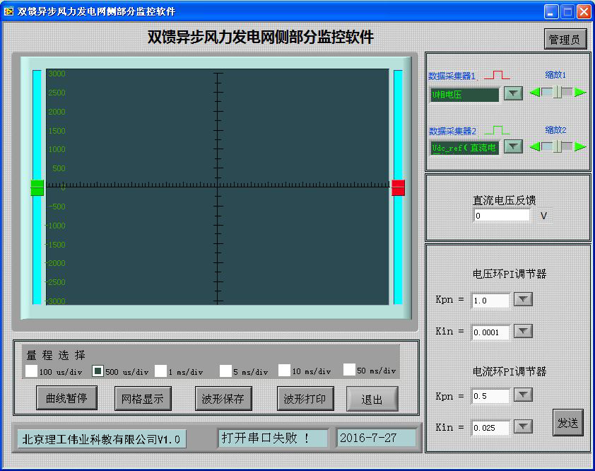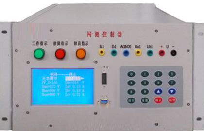 網(wǎng)側(cè)控制器面板安裝有三個(gè)信號(hào)指示燈,16鍵PVC軟鍵盤,240*128點(diǎn)蘭色液晶屏及7個(gè)波形測(cè)試端子。信號(hào)指示燈可對(duì)控制器工作、故障、卸荷狀態(tài)分別給于指示,通過鍵盤可完成并網(wǎng)啟動(dòng)/停止設(shè)置。液晶屏可完成三相電流,電壓有效值顯示,直流母線電壓顯示;面板觀測(cè)孔可觀測(cè)電網(wǎng)相電流波形、相電壓波形及直流母線電壓波形。