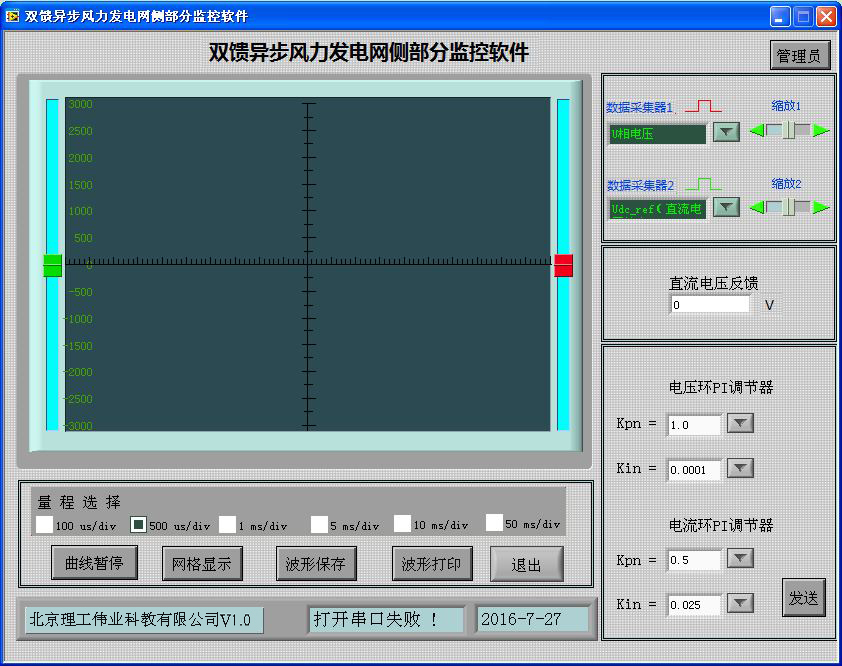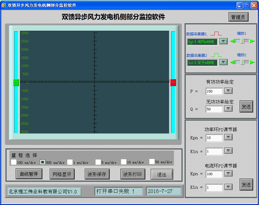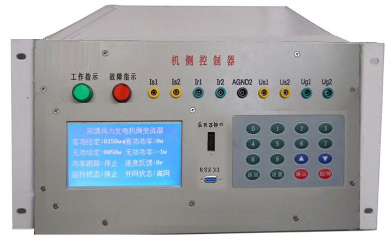 機(jī)側(cè)控制器的作用主要有兩個(gè)方面,一是給雙饋發(fā)電機(jī)的轉(zhuǎn)子提供勵(lì)磁分量的電流,從而可以調(diào)節(jié)雙饋發(fā)電機(jī)的定子側(cè)所發(fā)出的無(wú)功功率;二是通過(guò)控制雙饋發(fā)電機(jī)轉(zhuǎn)子轉(zhuǎn)矩分量的電流控制發(fā)電機(jī)的轉(zhuǎn)速或控制發(fā)電機(jī)定子側(cè)所發(fā)出的有功功率,從而使發(fā)電機(jī)運(yùn)行在風(fēng)力機(jī)的*佳功率曲線上,實(shí)現(xiàn)*大風(fēng)能追蹤(捕獲)運(yùn)行。機(jī)側(cè)控制器面板安裝有兩個(gè)信號(hào)指示燈,16鍵PVC軟鍵盤(pán),240*128點(diǎn)蘭色液晶屏及9個(gè)波形測(cè)試端子。信號(hào)指示燈可對(duì)控制器工作、保護(hù)狀態(tài)分別指示;鍵盤(pán)可完成機(jī)側(cè)控制器啟動(dòng)/停止設(shè)置,*大功率啟動(dòng)/停止跟蹤設(shè)置,有功/無(wú)功給定,手動(dòng)并網(wǎng)/離網(wǎng);液晶屏可顯示轉(zhuǎn)速反饋值,有功/無(wú)功反饋值;波形測(cè)試端子可通過(guò)示波器觀測(cè)發(fā)電機(jī)機(jī)轉(zhuǎn)子、定子相電流波形,可觀測(cè)發(fā)電機(jī)定子相電壓、電網(wǎng)相電壓波形。