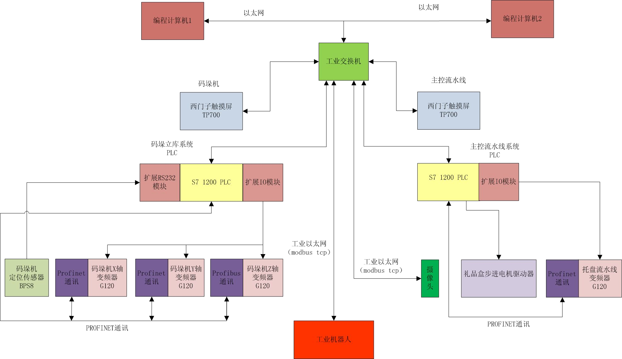 如上圖所示,整個系統(tǒng)通過工業(yè)以太網(wǎng)總線,把工業(yè)機器人、主控流水線 PLC、碼垛機立庫系統(tǒng) PLC、碼垛機立庫系統(tǒng)觸摸屏、主控流水線觸摸屏、視覺系統(tǒng)、變頻器以及編程開發(fā)計算機等均通過以太網(wǎng)連接。編程開發(fā)計算機負責開發(fā)調(diào)試程序、視覺系統(tǒng)特征識別開發(fā)以及機器人示教等編程。碼垛立庫系統(tǒng)和主控流水線觸摸屏負責管理碼垛立庫系統(tǒng)、主控流水線的運行參數(shù),以及系統(tǒng)報警和提示信息等。