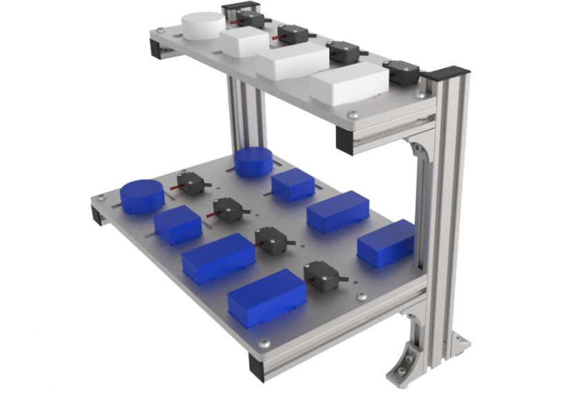 智能料庫分為上下兩層,每層設(shè)置 4 個(gè)工位。每個(gè)工位都可以放置正方形、長方形或圓形的物料。同時(shí),每個(gè)工位安裝有傳感檢測裝置,可自行判斷此工位是否有物料。