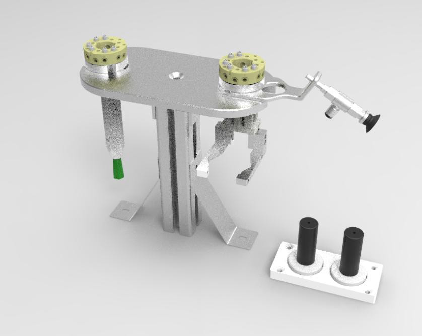 6、機(jī)器人工具模塊機(jī)器人末端工具是機(jī)器人的執(zhí)行單元,如圖 8 所示此模塊包括尖點(diǎn)輔助工具、筆工具、氣動(dòng)夾爪工具和氣動(dòng)吸盤工具。尖點(diǎn)輔助工具形狀為圓錐,具有TCP 校準(zhǔn)功能,同時(shí)可以模擬去毛刺、涂膠工具。筆工具、夾爪工具和吸盤工具都配備了機(jī)械快換工具,與機(jī)器人法蘭盤的機(jī)械快換工具配套使用,可實(shí)現(xiàn)工具的快速更換。筆工具內(nèi)部設(shè)置有緩沖裝置,可以有效減少學(xué)生初步學(xué)習(xí)機(jī)器人操作時(shí),由于不熟練導(dǎo)致剛性碰撞產(chǎn)生對(duì)工具的損壞。筆工具可以完成軌跡、寫字和繪畫等實(shí)驗(yàn)內(nèi)容,彩筆可快速更換。夾爪工具和吸盤工具采用國際知名品牌, 用于物料的抓取和吸附。