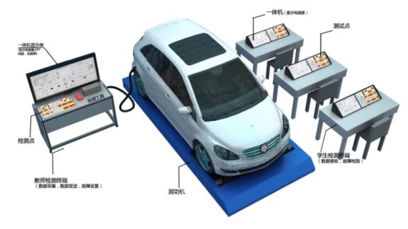 2.檢測(cè)操作臺(tái)通過(guò)便捷測(cè)量盒組件是以整車(chē)為基礎(chǔ),在不破壞原車(chē)電路情況下,可以輕松的串聯(lián)在控制模塊和原車(chē)線(xiàn)束之間;通過(guò)裝有與原車(chē)插頭配套插接器的線(xiàn)束,連接故障設(shè)置終端,故障設(shè)置終端通過(guò)專(zhuān)用線(xiàn)束連接檢測(cè)臺(tái),實(shí)現(xiàn)整車(chē)各系統(tǒng)電路教學(xué)、實(shí)訓(xùn)考核的多功能教學(xué)設(shè)備;