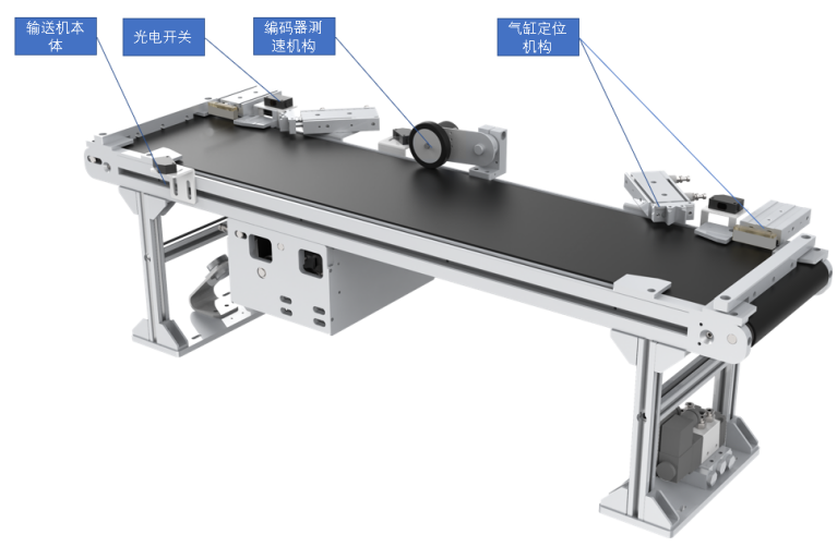皮帶輸送單元是設(shè)備的重要組成部分,負(fù)責(zé)接駁CPU托盤的運(yùn)輸,包括輸送機(jī)本體、氣缸定位機(jī)構(gòu)、編碼器測速機(jī)構(gòu)、光電開關(guān)等組件構(gòu)成,如圖所示。芯片托盤在兩端位置可以用氣缸定位機(jī)構(gòu)定位,方便機(jī)器人精準(zhǔn)上料,編碼器可以實(shí)時(shí)測得皮帶線速度,以結(jié)合機(jī)器人和視覺相機(jī)進(jìn)行動(dòng)態(tài)抓取及物料識(shí)別。側(cè)面具有光電開關(guān),可檢測芯片托盤位置。如圖所示