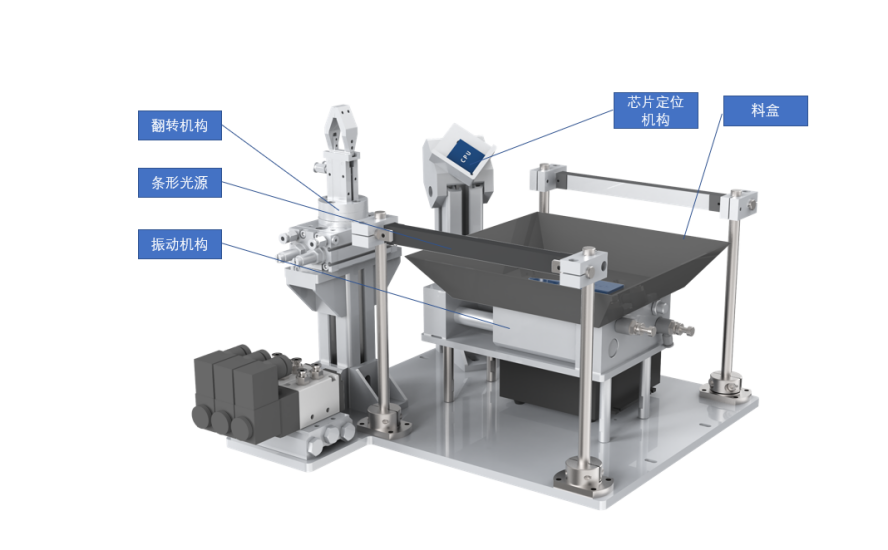 芯片供料單元由料盒、翻轉(zhuǎn)機(jī)構(gòu)、芯片定位機(jī)構(gòu)、條形光源等組成。芯片可以在翻轉(zhuǎn)機(jī)構(gòu)上進(jìn)行正反方向改變,料盒振動(dòng)功能,由氣缸伸縮實(shí)現(xiàn)??蓪?shí)現(xiàn)芯片的重新排列。料盒兩側(cè)具有條形光源,可補(bǔ)償外部環(huán)境對于視覺的干擾。芯片定位機(jī)構(gòu)是利用芯片的自重可進(jìn)行二次定位,以便于協(xié)作機(jī)器人精準(zhǔn)取放。如圖所示