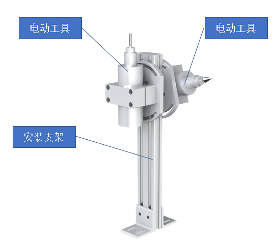 加工單元由安裝架體、銑刀電動(dòng)工具、打磨電動(dòng)工具等組成,可對零件表面進(jìn)行銑削以及打磨,并且兩個(gè)工具都可以調(diào)整角度,方便與機(jī)器人進(jìn)行角度配合。非常詳細(xì)的展示實(shí)際生產(chǎn)中這兩種不同的加工工藝,極大的加深了學(xué)生對兩種工藝?yán)斫夂驼J(rèn)知。如圖所示。