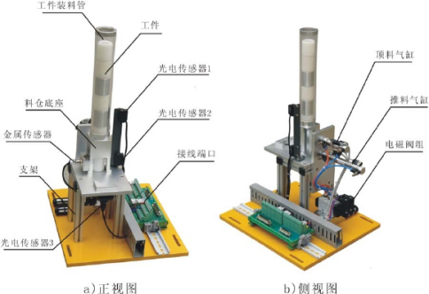 主要由井式工件庫(kù)、推料氣缸、物料臺(tái)、光電傳感器、磁性開(kāi)關(guān)、電磁閥、支架、機(jī)械零部件構(gòu)成。 |