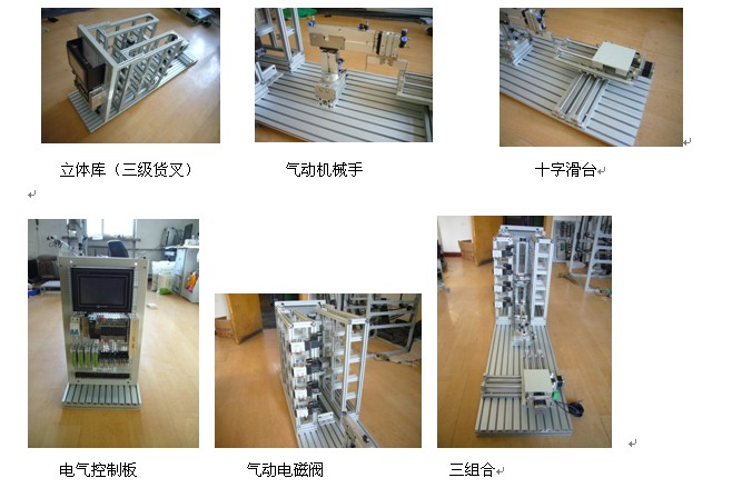 LGZH-02 柔性三組合機(jī)電一體化創(chuàng)新模型實(shí)現(xiàn)動(dòng)作為:首先立體庫(kù)堆垛機(jī)具有水平垂直運(yùn)動(dòng),由步進(jìn)電機(jī)拖動(dòng),帶動(dòng)貨叉,進(jìn)行貨物存取,貨叉為三級(jí)機(jī)械傳動(dòng)。氣動(dòng)機(jī)械手可實(shí)現(xiàn)手爪抓取,提升,轉(zhuǎn)半圈,放下,松開(kāi)手爪。十字滑臺(tái)可走出四角上一周的四個(gè)位置,上方裝有筆架,可以繪圖寫字,上方還裝有接近開(kāi)關(guān)和顏色開(kāi)關(guān)及支架,可對(duì)滑臺(tái)上的物體進(jìn)行識(shí)別。