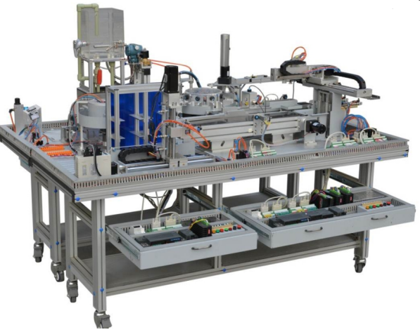 系統(tǒng)由鍵盤抽屜、電腦桌、主桌體、觸摸屏模塊、、掛箱抽屜、包裝蓋章單元、桌面接口線路板、立體倉庫單元、執(zhí)行機(jī)構(gòu)線路板、氣源三聯(lián)件、轉(zhuǎn)盤上料單元、加熱與檢測單元、1#輸送帶模塊、灌裝加蓋單元、2#輸送帶模塊、3#輸送帶單元、機(jī)器人搬運(yùn)單元等組成。