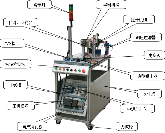 由滾珠絲杠、滑桿推出部件、分類料倉(cāng)、步進(jìn)電機(jī)、步進(jìn)驅(qū)動(dòng)器、電感傳感器、開(kāi)關(guān)電源、可編程序控制器、按鈕、I/O接口板、通訊接口板、電氣網(wǎng)孔板、多種類型電磁閥及氣缸組成,主要完成按工件類型分類,將工件推入料倉(cāng)。