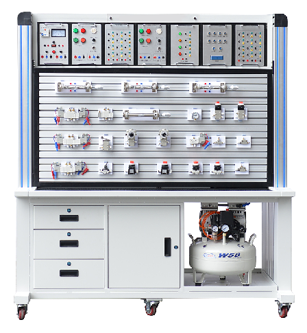 本實(shí)訓(xùn)裝備,由氣動(dòng)元件部分、電氣控制部分及實(shí)訓(xùn)臺(tái)架等組成,電氣部分主要由PLC模塊、繼電器模塊、電源模塊、按鈕模塊等部分組成。實(shí)訓(xùn)臺(tái)主體框架采用鋁木結(jié)構(gòu)組裝完成,臺(tái)架重量較輕且安裝了萬向輪,可方便實(shí)訓(xùn)臺(tái)的移動(dòng)。臺(tái)架分上下兩層結(jié)構(gòu),上面可放置電氣模塊,下面是實(shí)訓(xùn)屏,實(shí)訓(xùn)屏采用帶槽鋁合金結(jié)構(gòu),方便各氣動(dòng)元件的安裝和拆卸,學(xué)生可以根據(jù)實(shí)驗(yàn)需要在實(shí)訓(xùn)屏上任意搭建氣動(dòng)回路,組成具有一定功能的氣動(dòng)系統(tǒng)。實(shí)訓(xùn)臺(tái)采用模塊式結(jié)構(gòu),便于組合與擴(kuò)展,提高了設(shè)備空間的利用率。